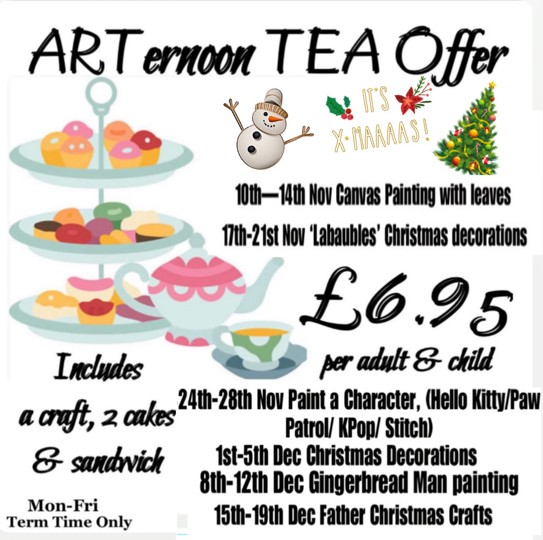Includes a craft for the child (changed weekly), plus scones or sandwich with jam, cakes and drinks for 2 (1 adult & 1 child) – all for just £6.95. It’s £4.95 per additional child and £2.95 per additional adult.