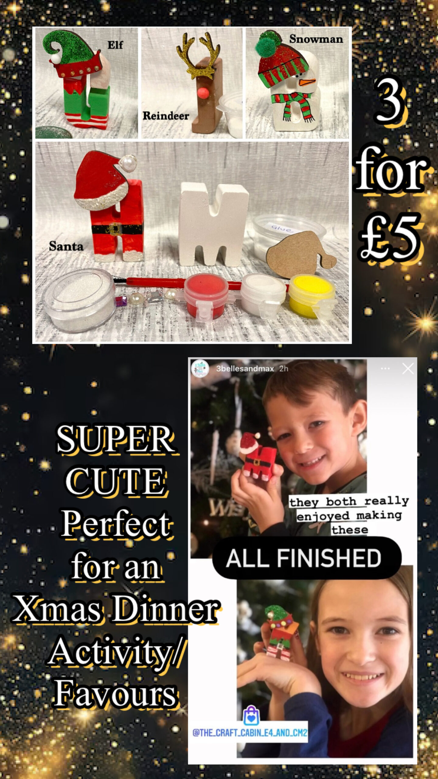 – 3 Christmas Letter Craft Kits – with either reindeer antlers, snowman, elf or Santa hat (message us which letters you’d like)